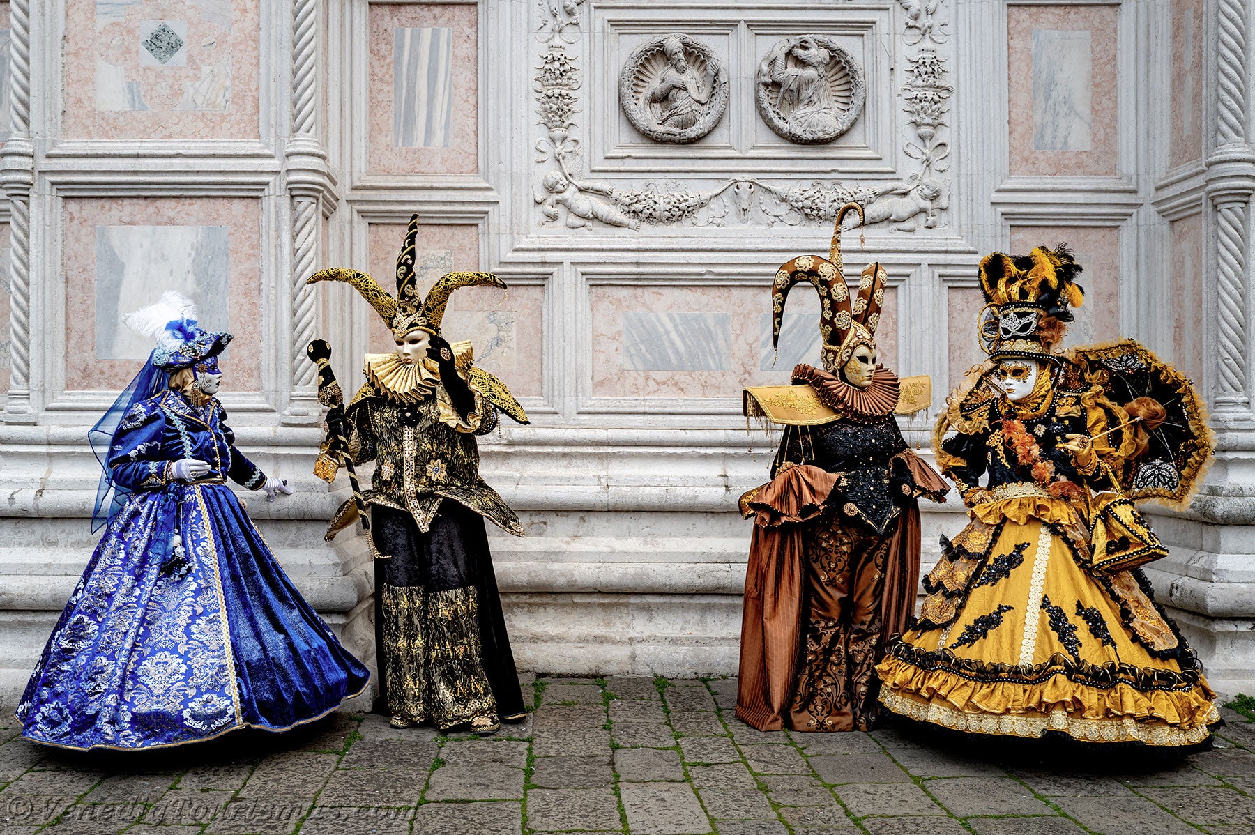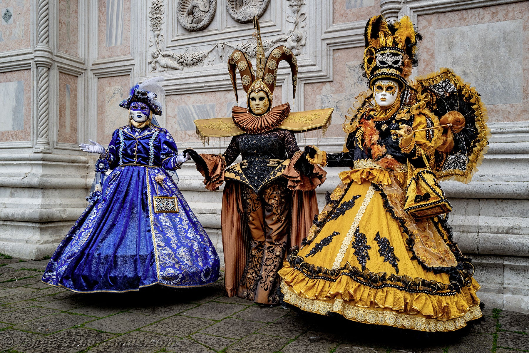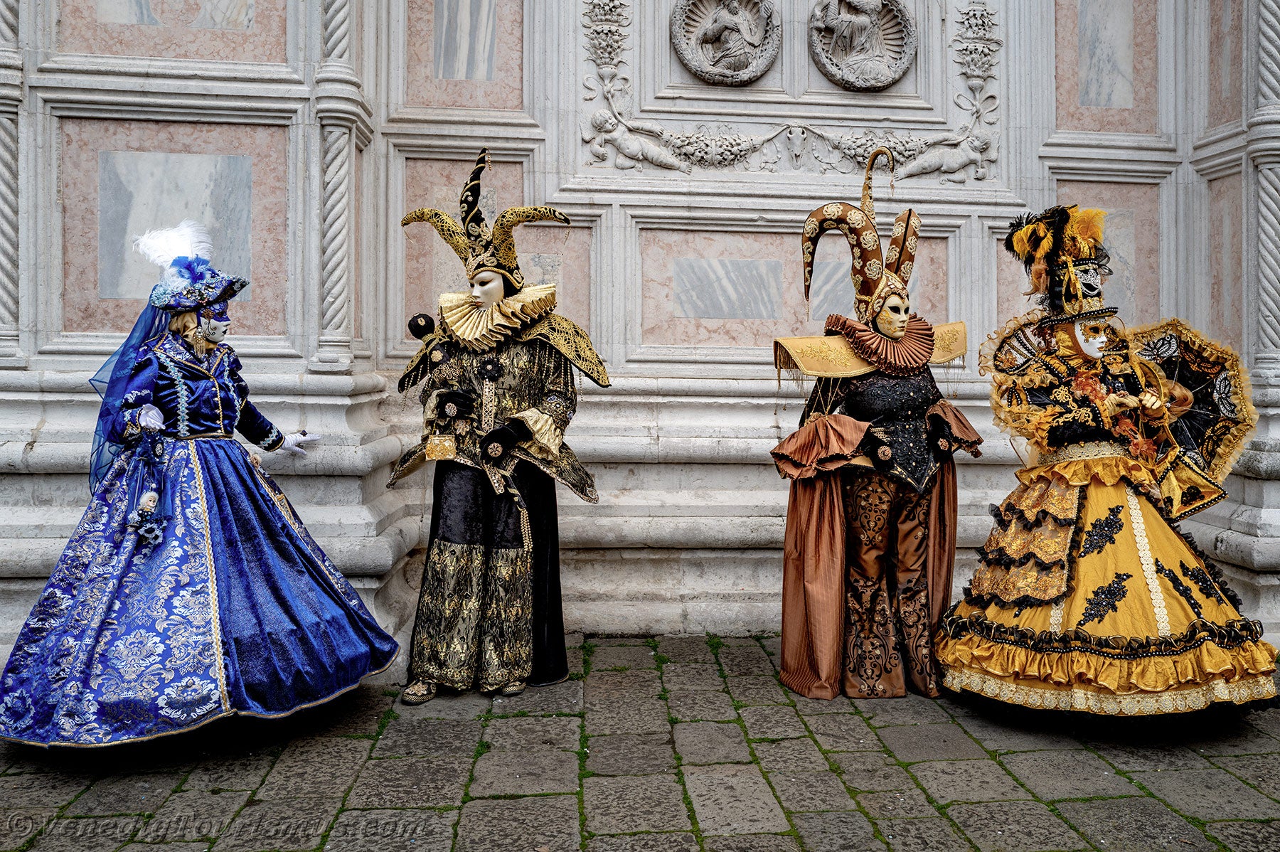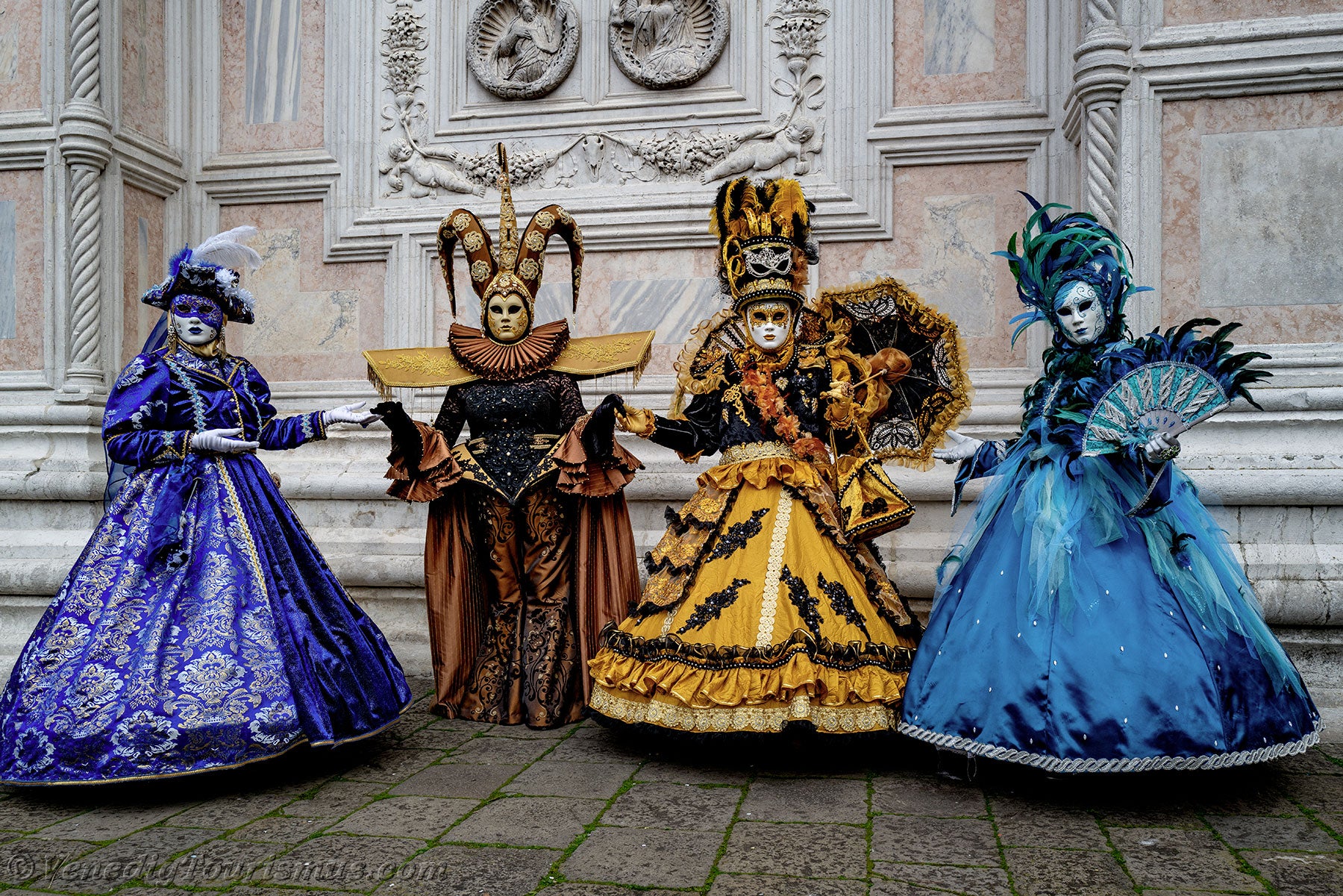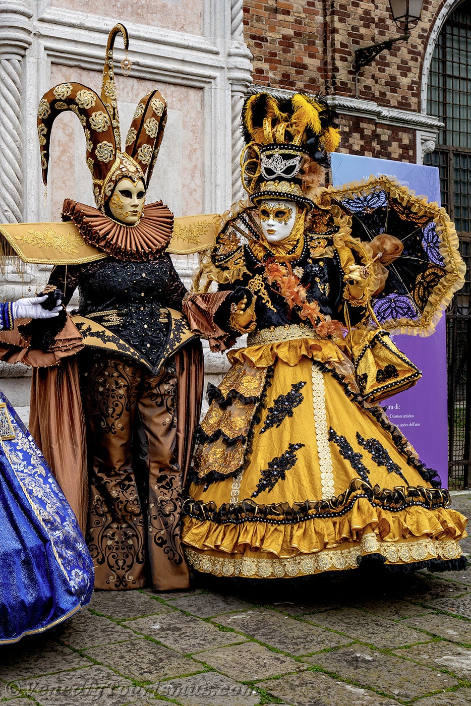 Gold und Azurblau der Kostüme vermischten sich auf dem Campo San Zaccaria während des Karnevals von Venedig 2026.Kopfbedeckungen so vielfältig wie originell, Dreispitzhüte, Spitzen und Federn verschönerten Kleider aus prächtigen Stoffen, die mit Stickereien verziert waren.