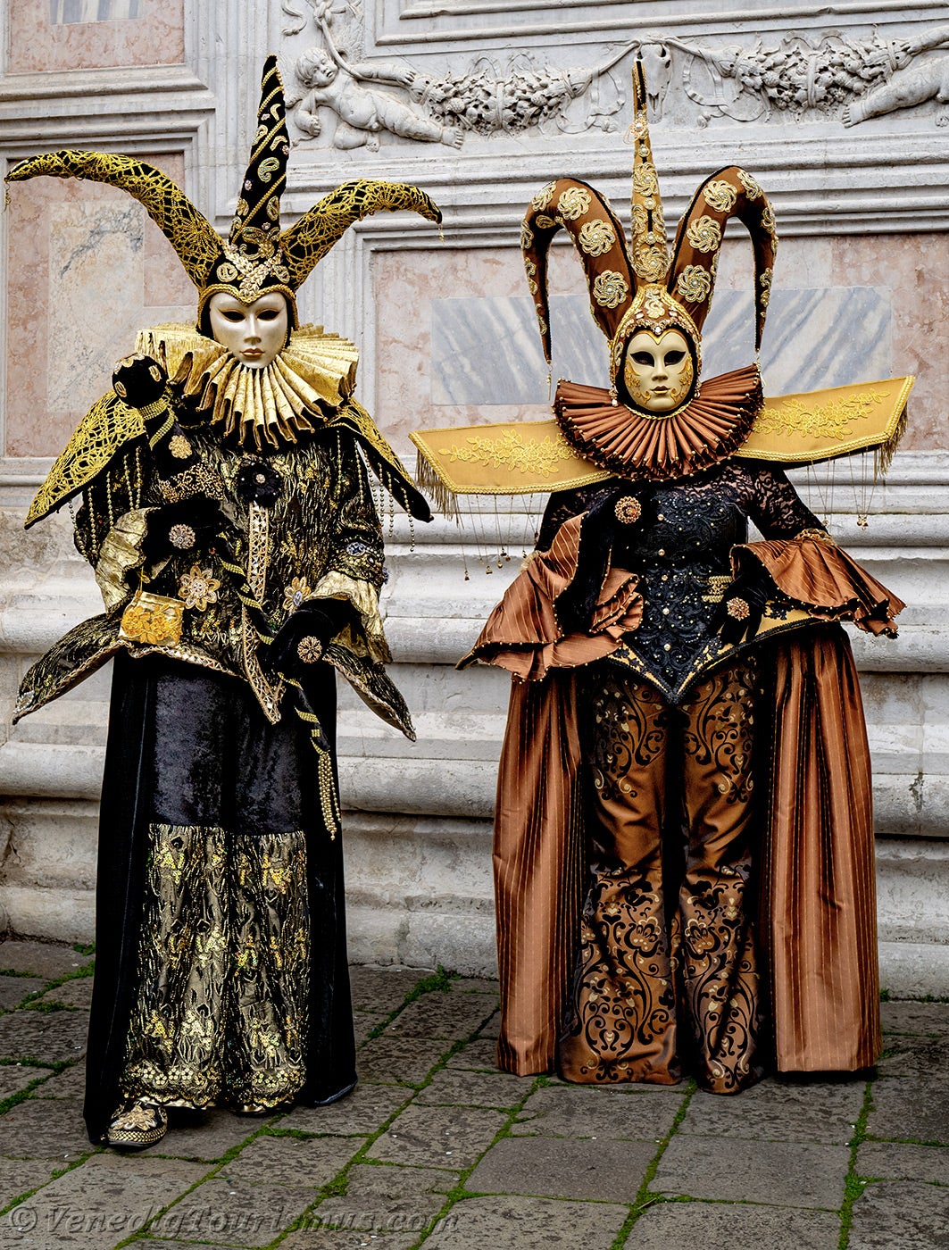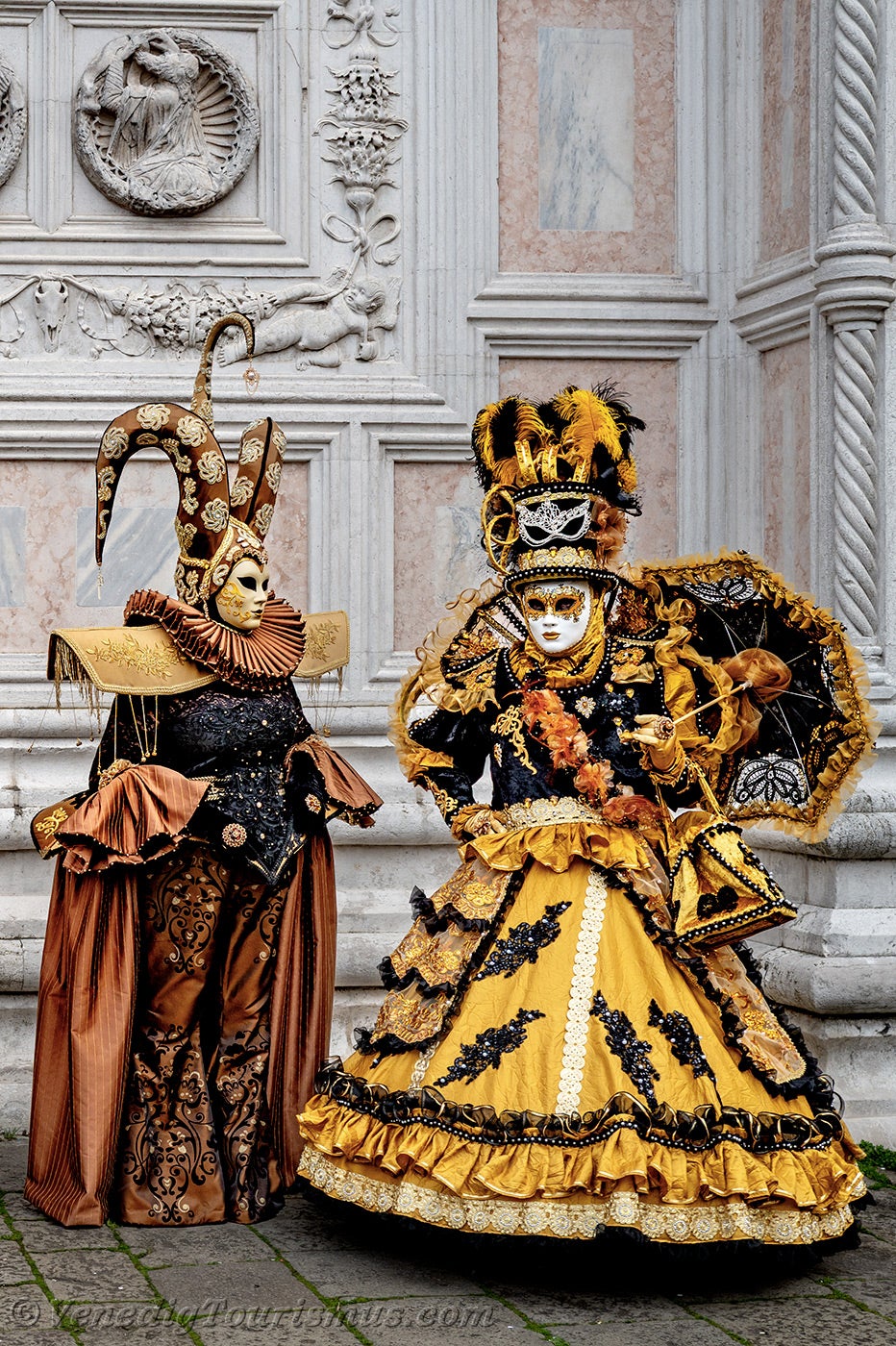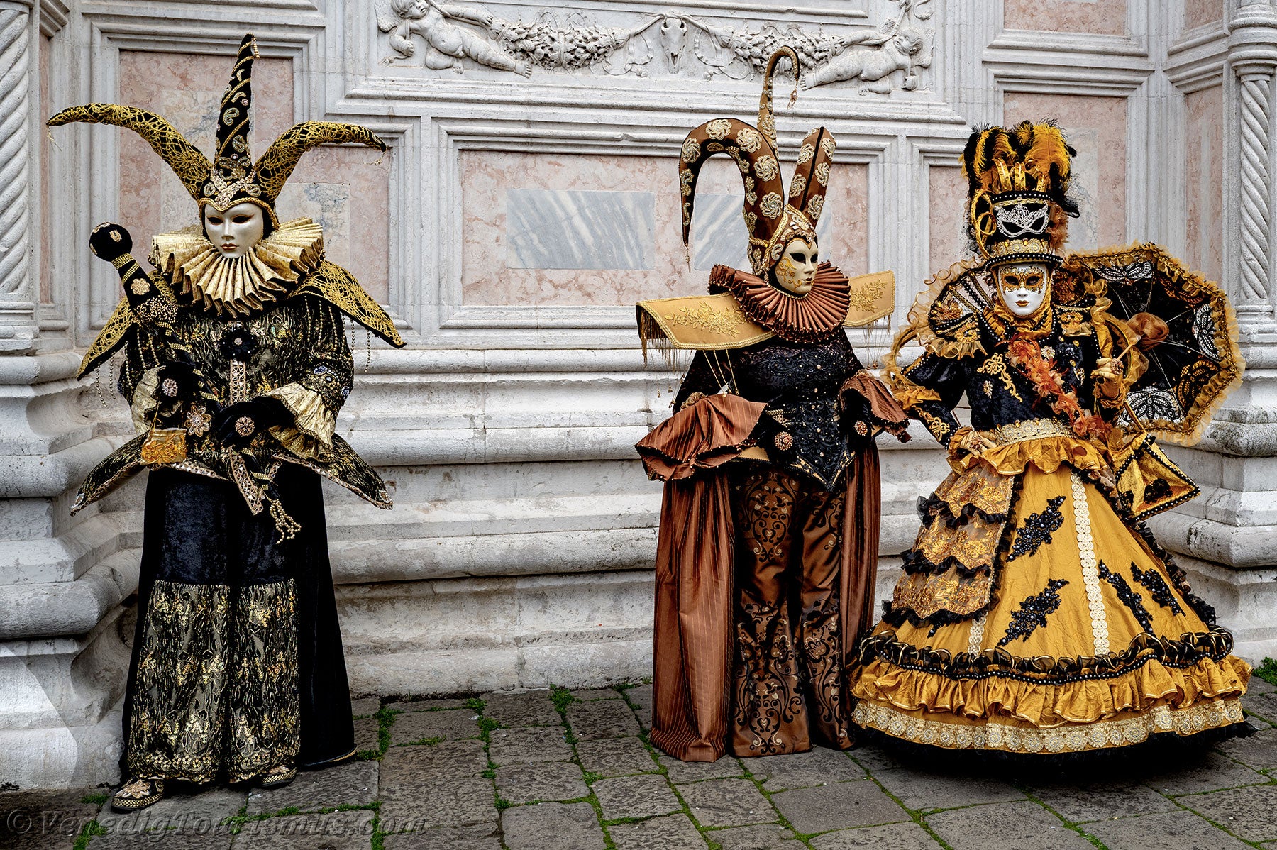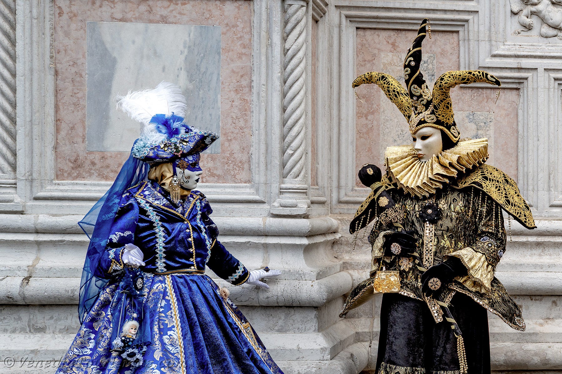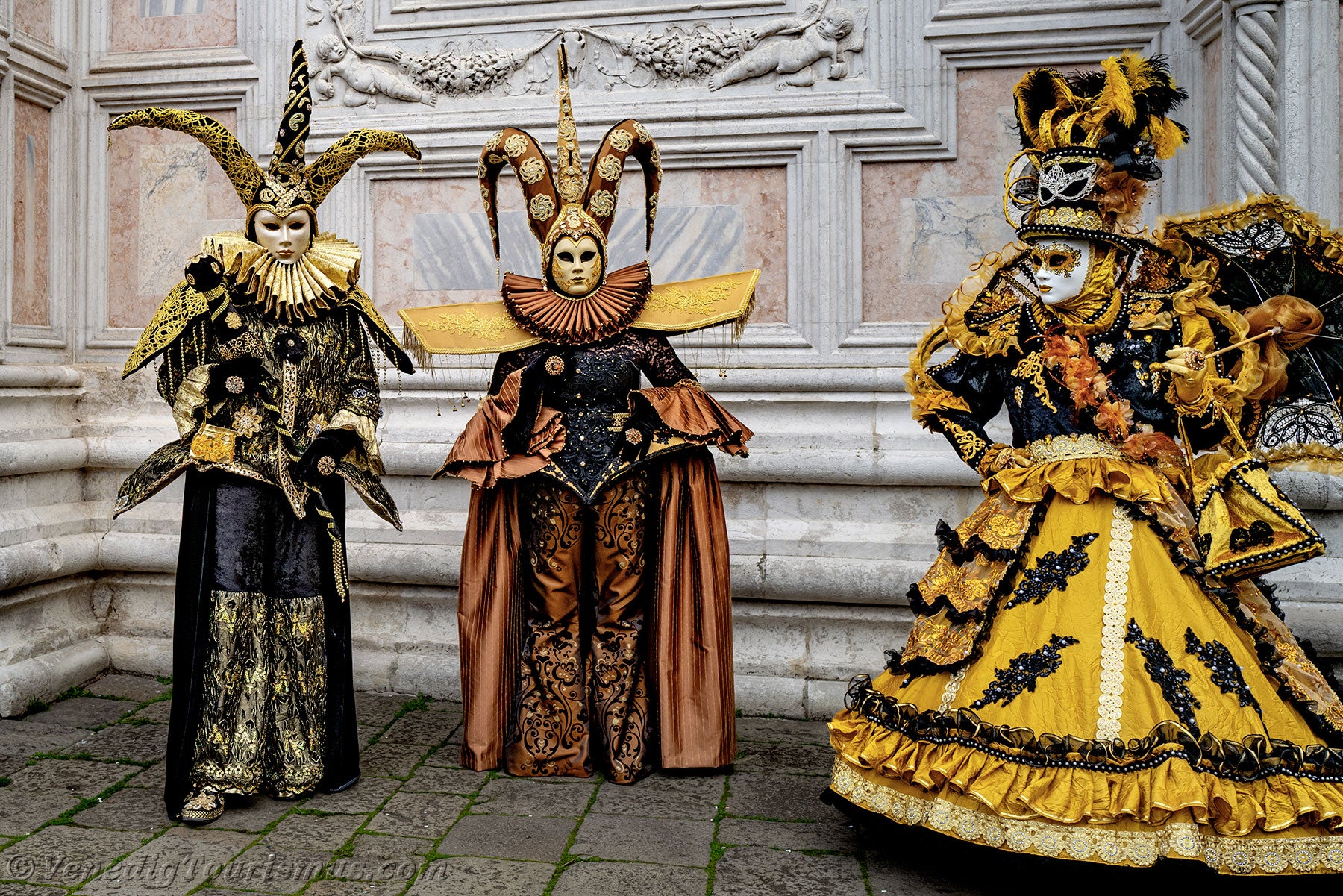 Gold und Azurblau der Kostüme vermischten sich auf dem Campo San Zaccaria während des Karnevals von Venedig 2026.Kopfbedeckungen so vielfältig wie originell, Dreispitzhüte, Spitzen und Federn verschönerten Kleider aus prächtigen Stoffen, die mit Stickereien verziert waren.