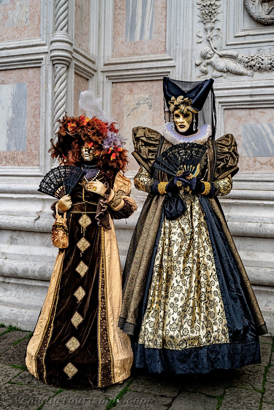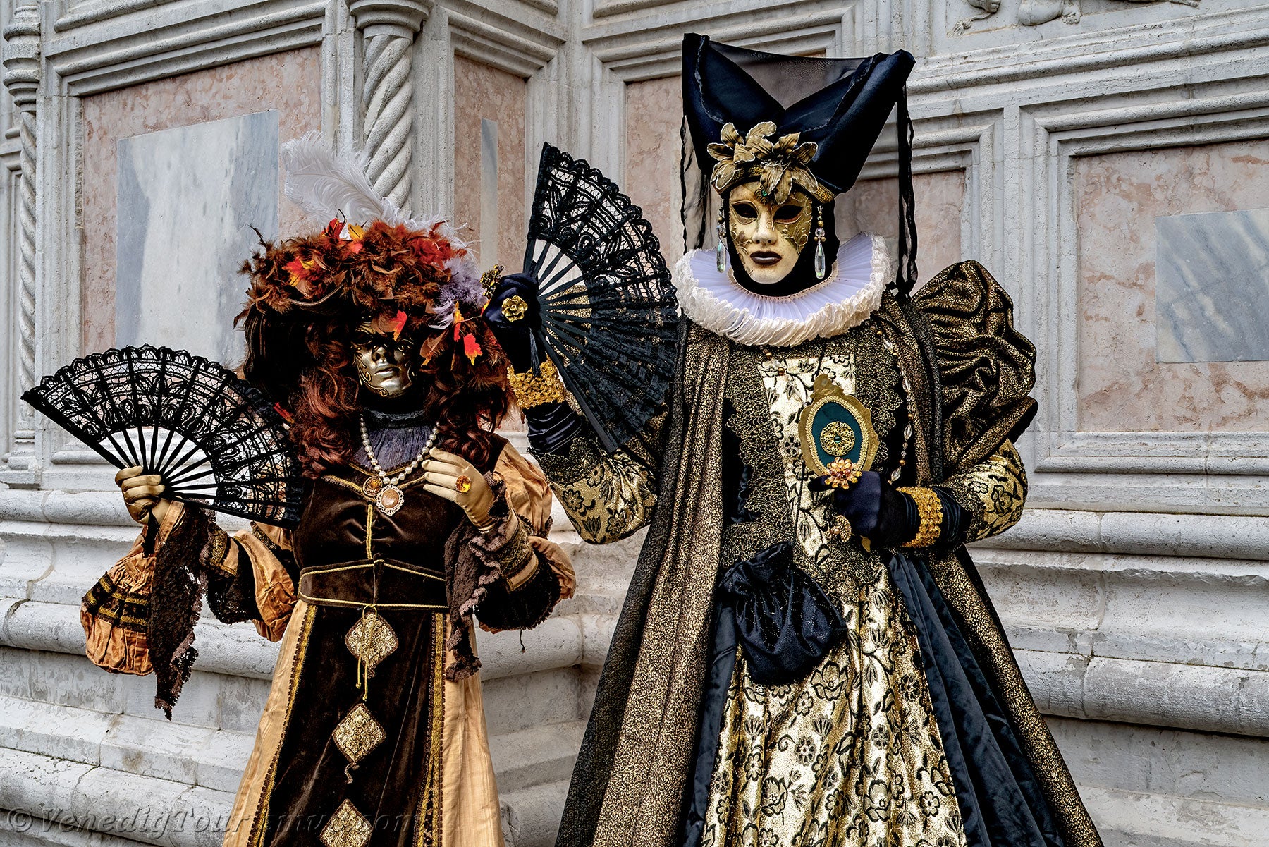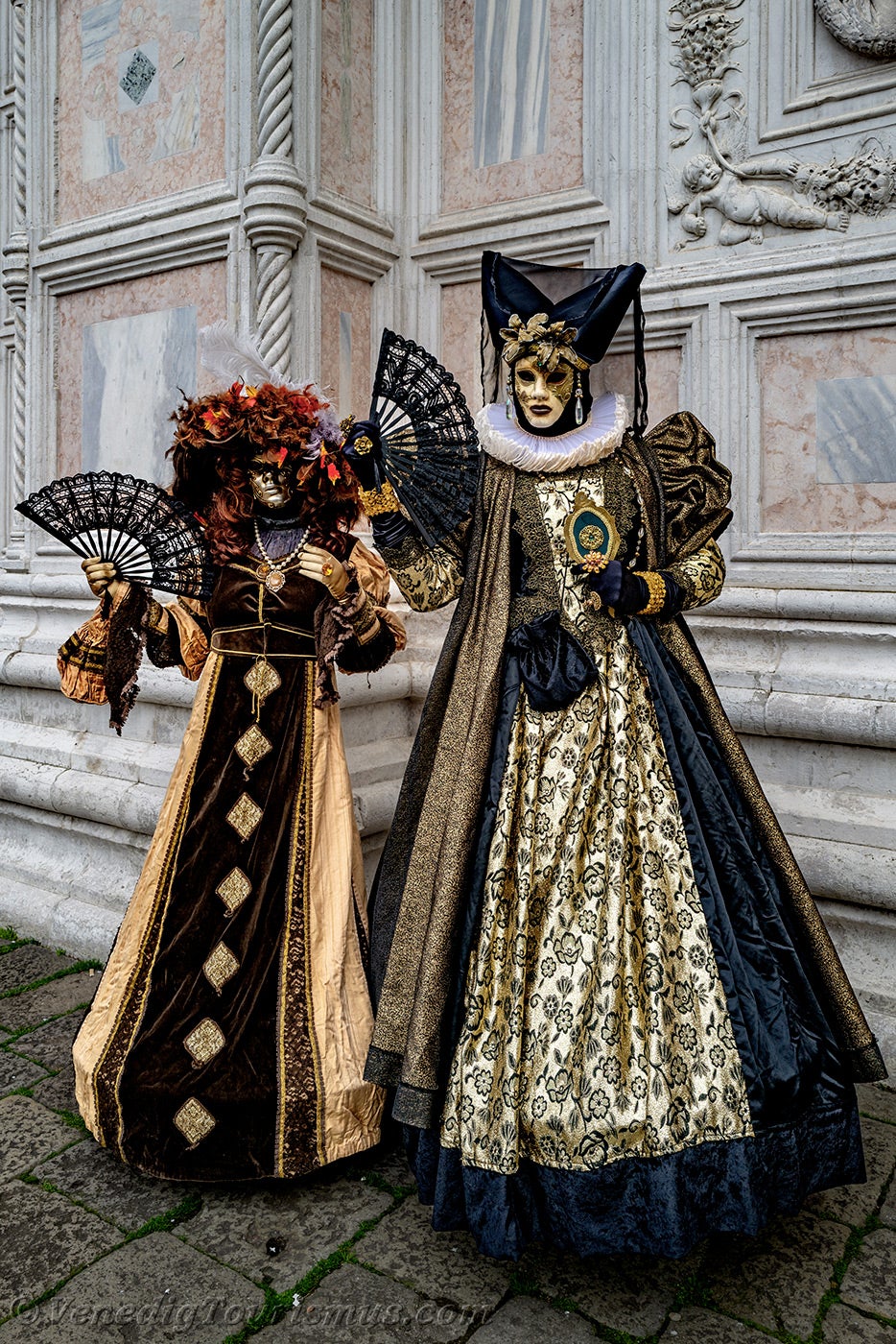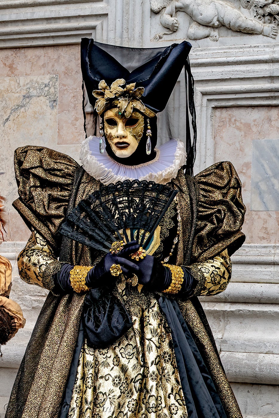 Nachdem diese wenig beruhigenden Löwen sich entfernt hatten, nahmen eine edle Dame in Schwarz und Gold und ihre Zofe mit einer mit Blumen verzierten Kopfbedeckung vor der Kirche San Zaccaria Platz.