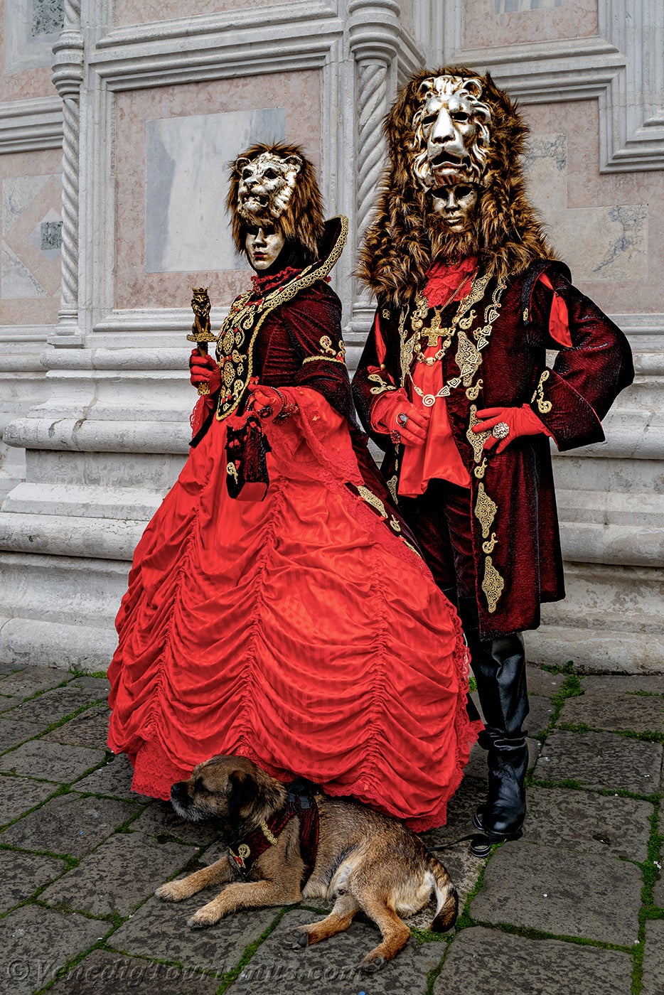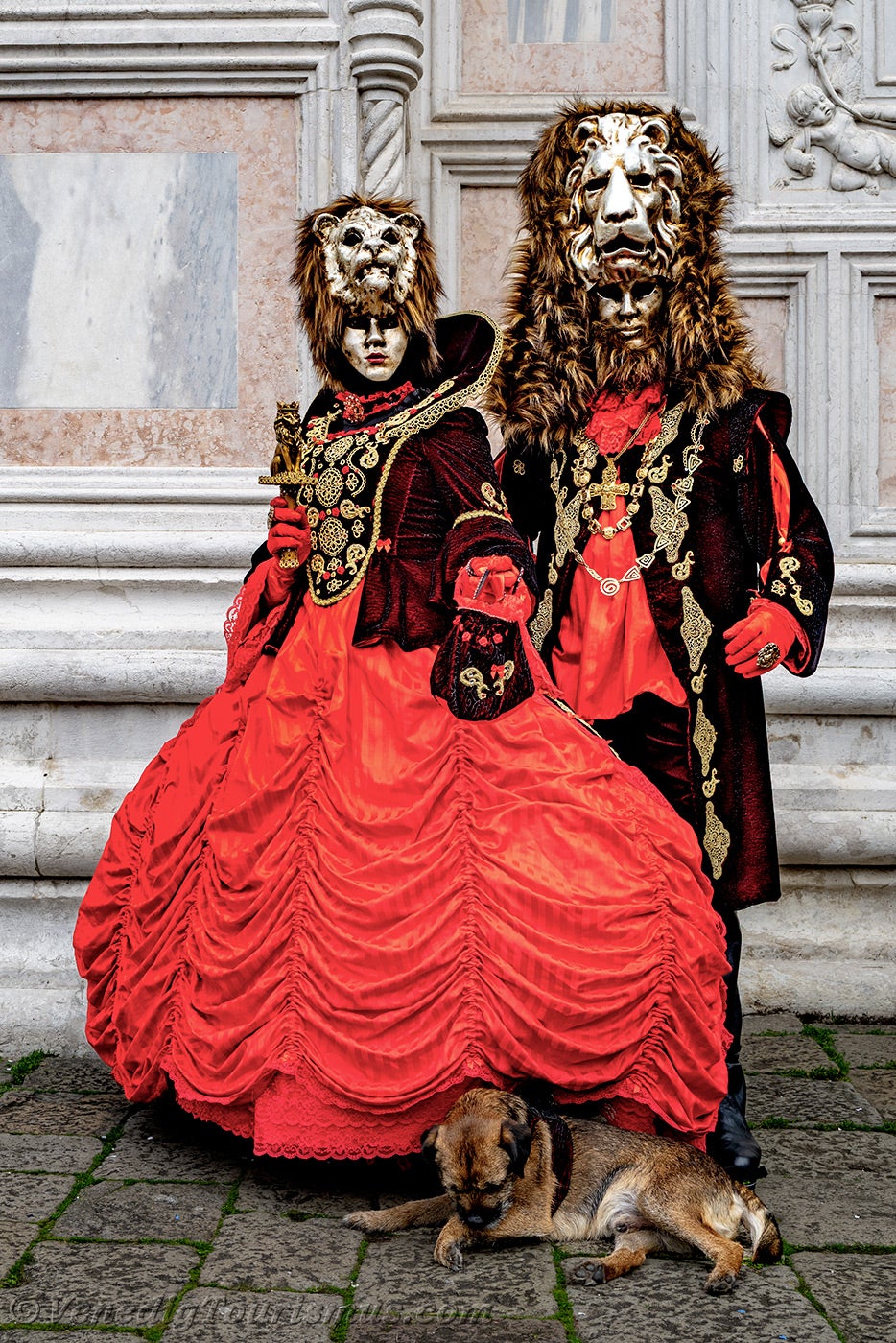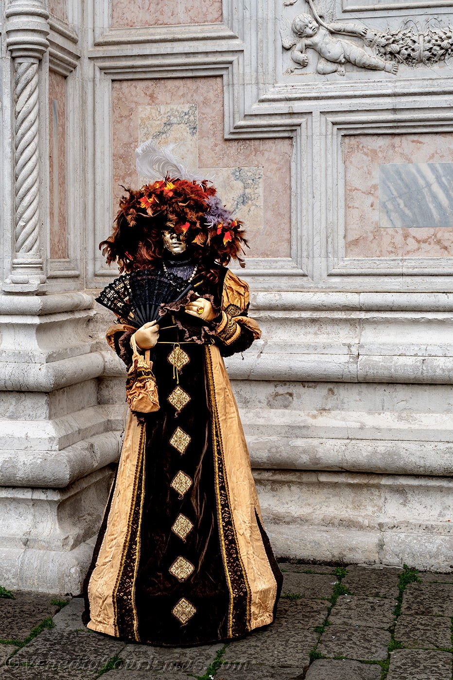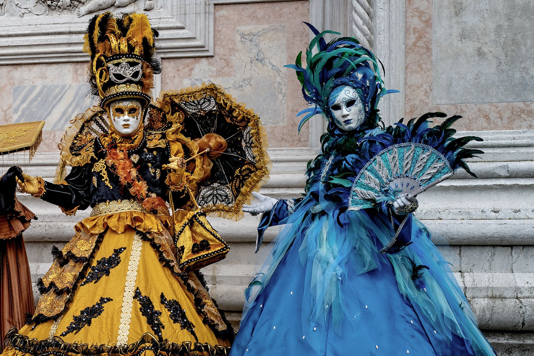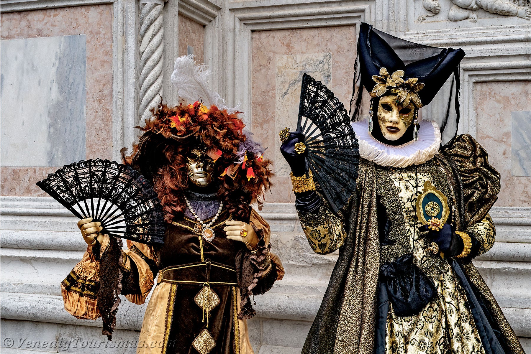 Nachdem diese wenig beruhigenden Löwen sich entfernt hatten, nahmen eine edle Dame in Schwarz und Gold und ihre Zofe mit einer mit Blumen verzierten Kopfbedeckung vor der Kirche San Zaccaria Platz.